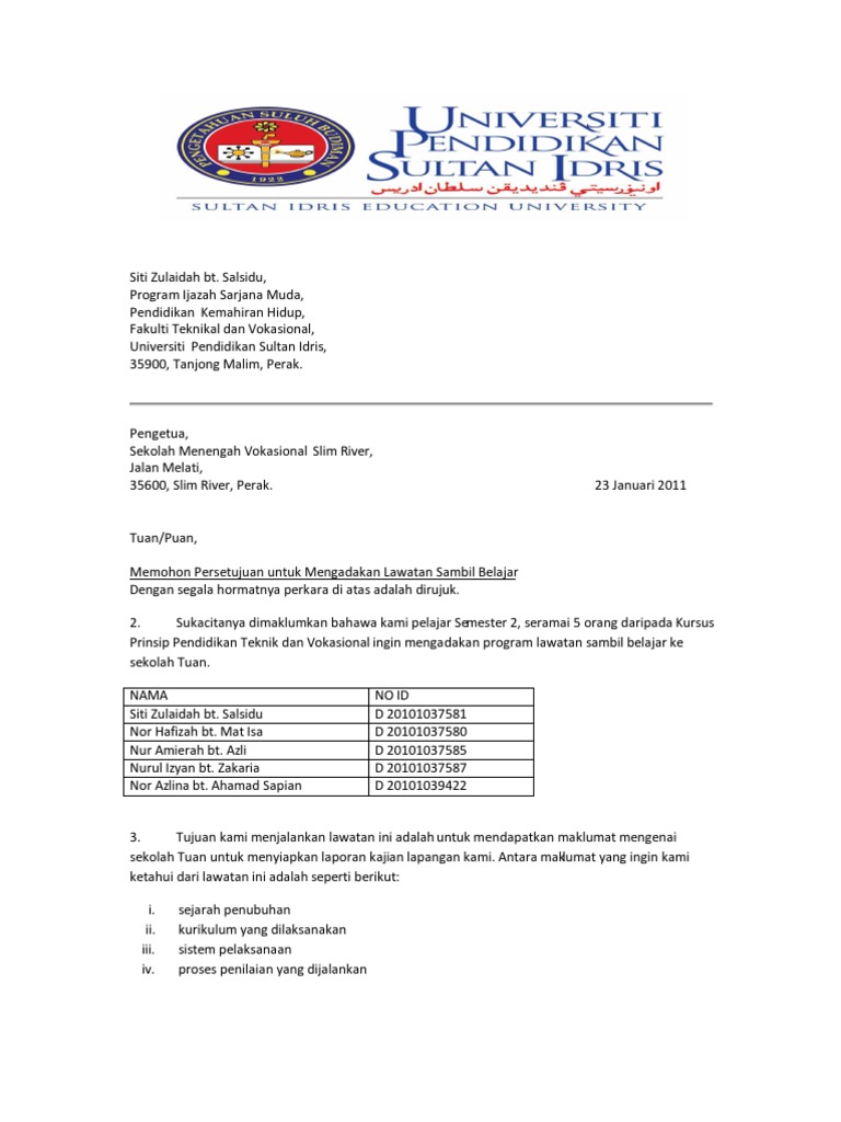 Surat Kiriman Rasmi Permohonan Mengadakan Lawatan Sambil Belajar Pdf