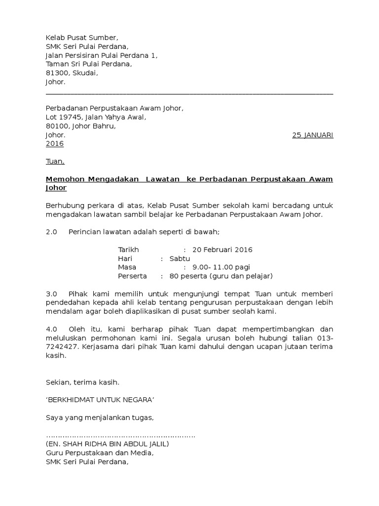 Contoh Surat Rasmi Membuat Lawatan Ke Perpustakaan